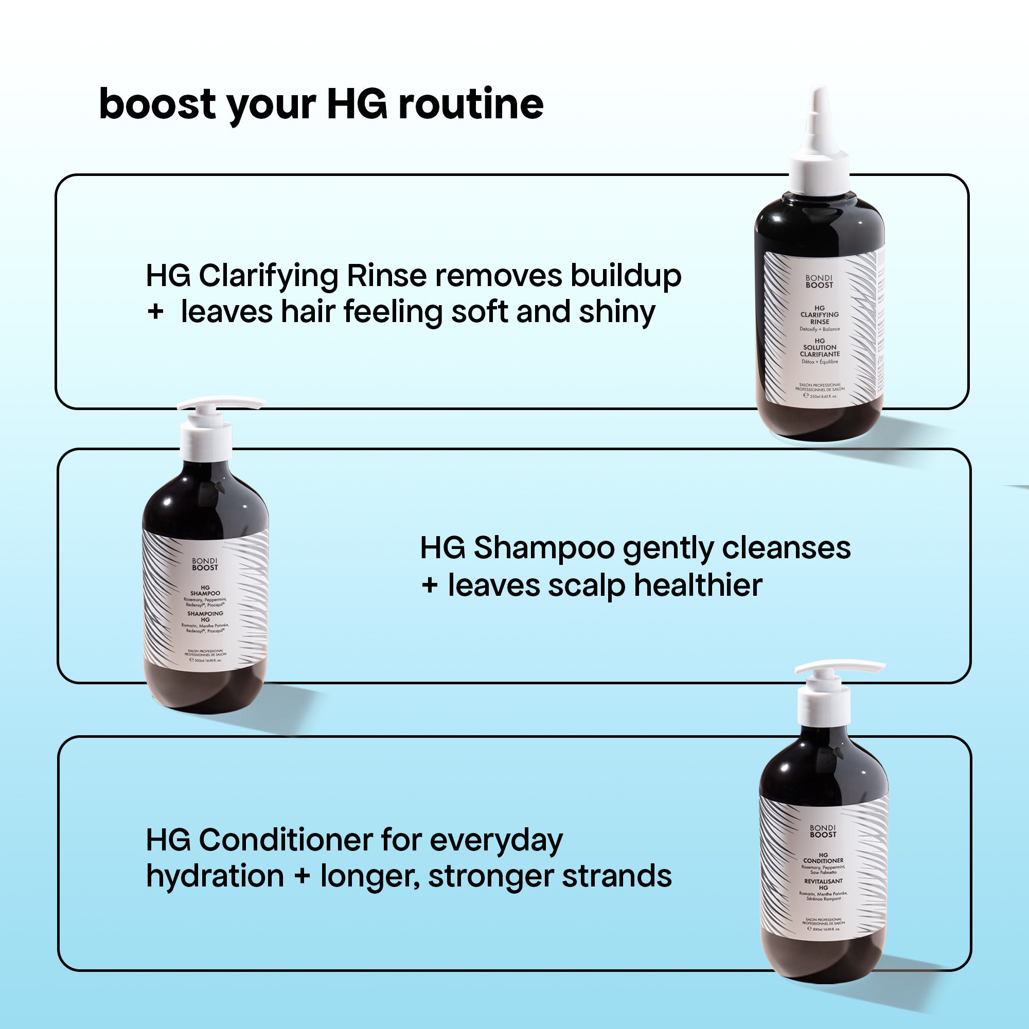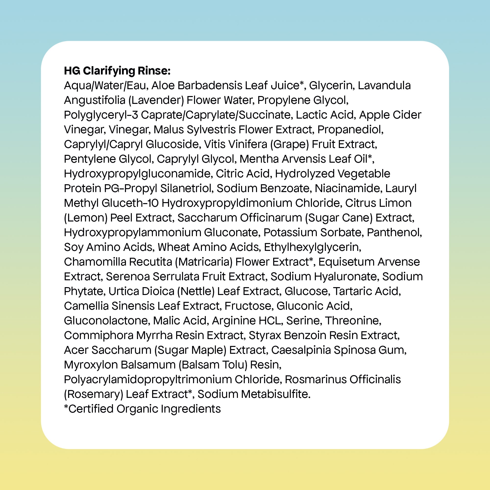 Healthy hair starts with a healthy scalp. To supercharge your HG journey. start with our detoxifying scalp and hair rinse. This natural. deep cleanse uses Lactic Acid and Apple Cider Vinegar to gently exfoliate. eliminate build-up. and excess oil. clearing the way for new hair to grow. Infused with Peppermint oil for a cooling. refreshing treatment that will leave your scalp ultra clean. and your hair softer and shinier.
