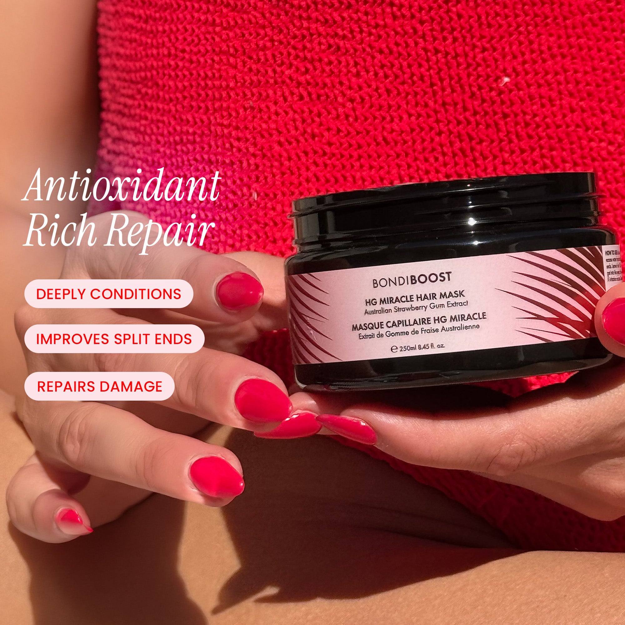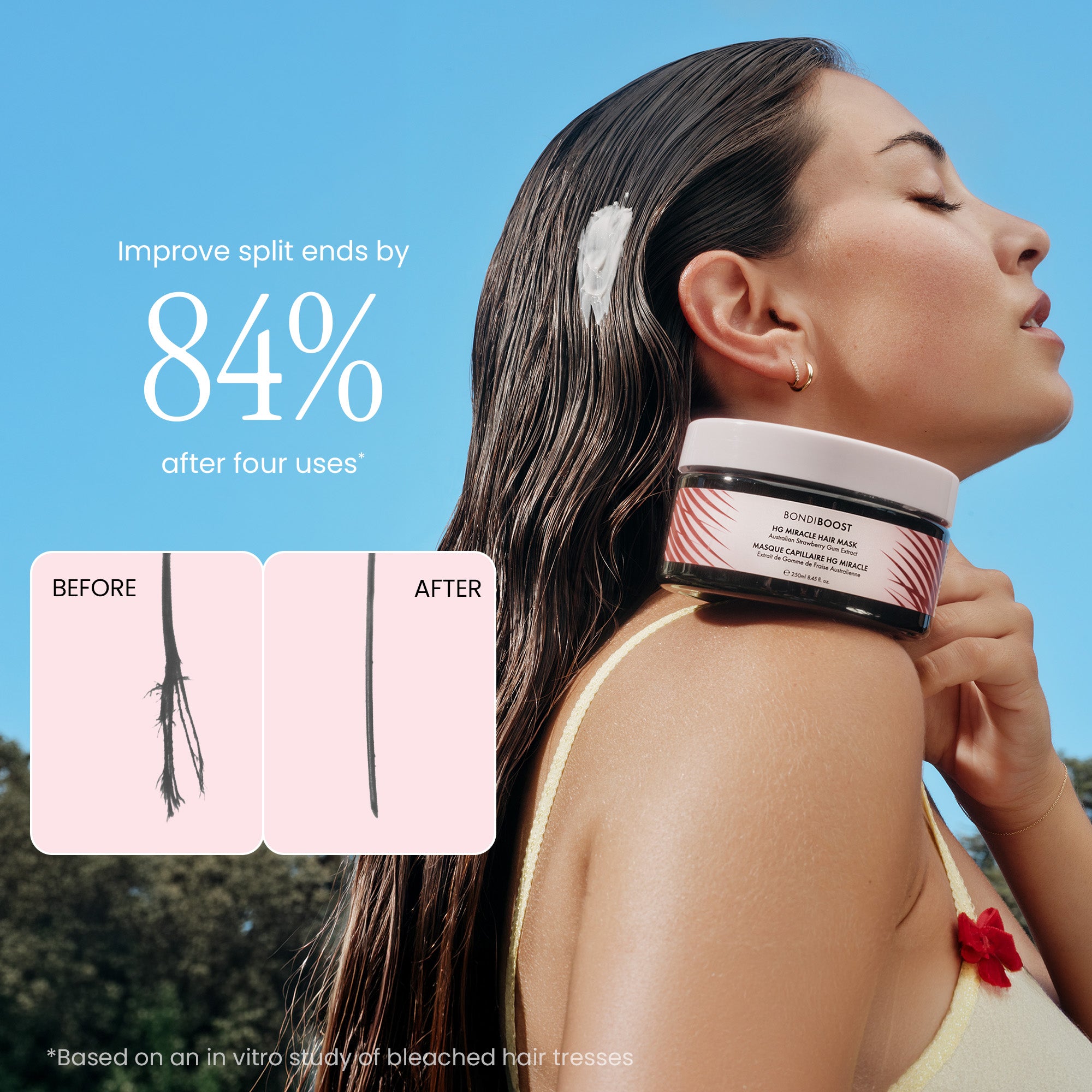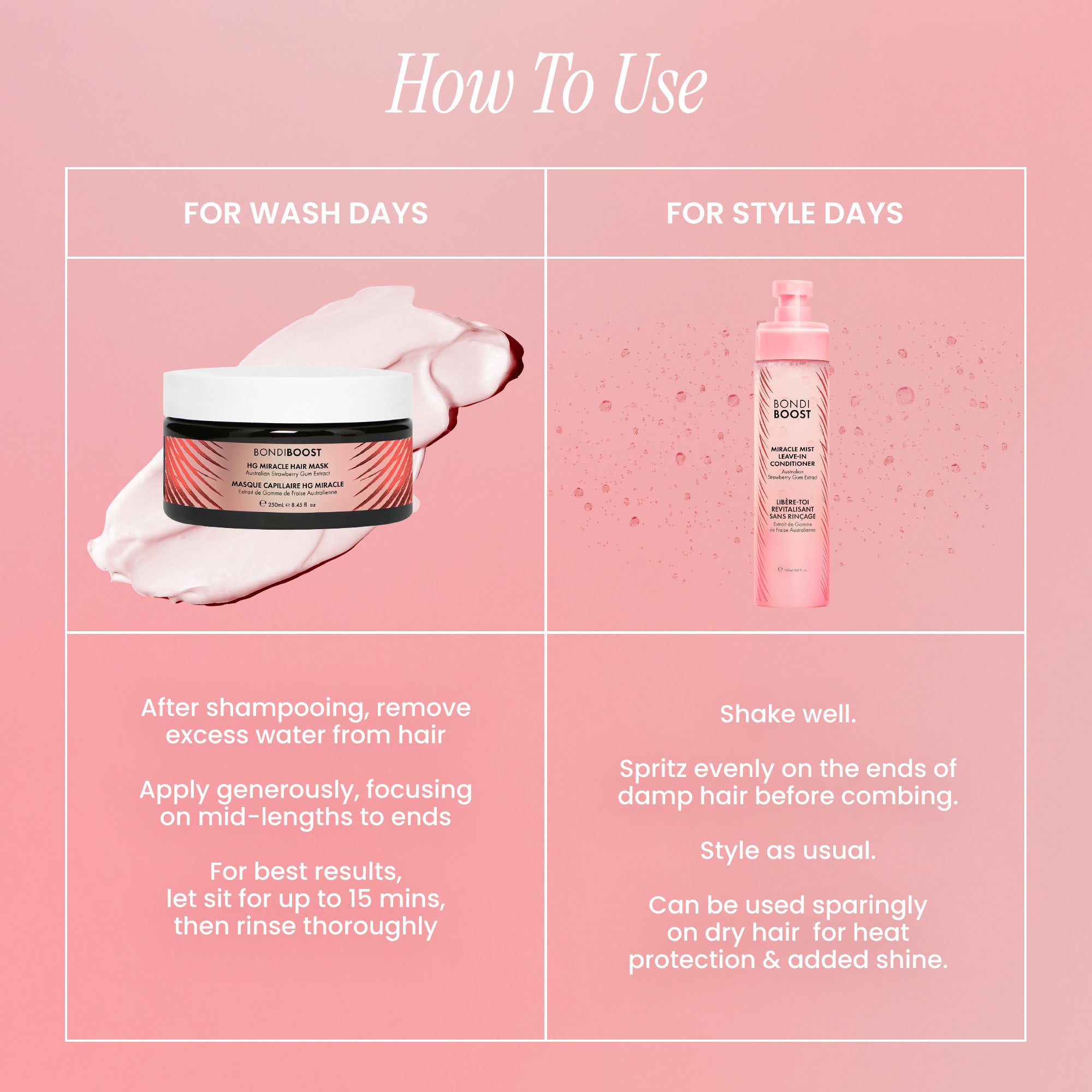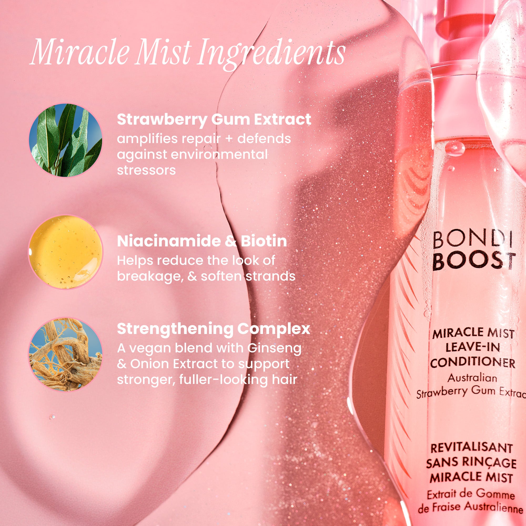 Powered by antioxidant-rich Australian Strawberry Gum Extract. this duo helps defend against daily stressors while enhancing softness. smoothness. and shine. The award-winning Miracle Hair Mask is clinically proven to improve split ends after 4 uses*. deeply conditioning strands without weighing them down. Miracle Mist adds lightweight hydration. detangles. boosts high-impact gloss. and provides instant heat protection while helping reduce the look of breakage and shedding.