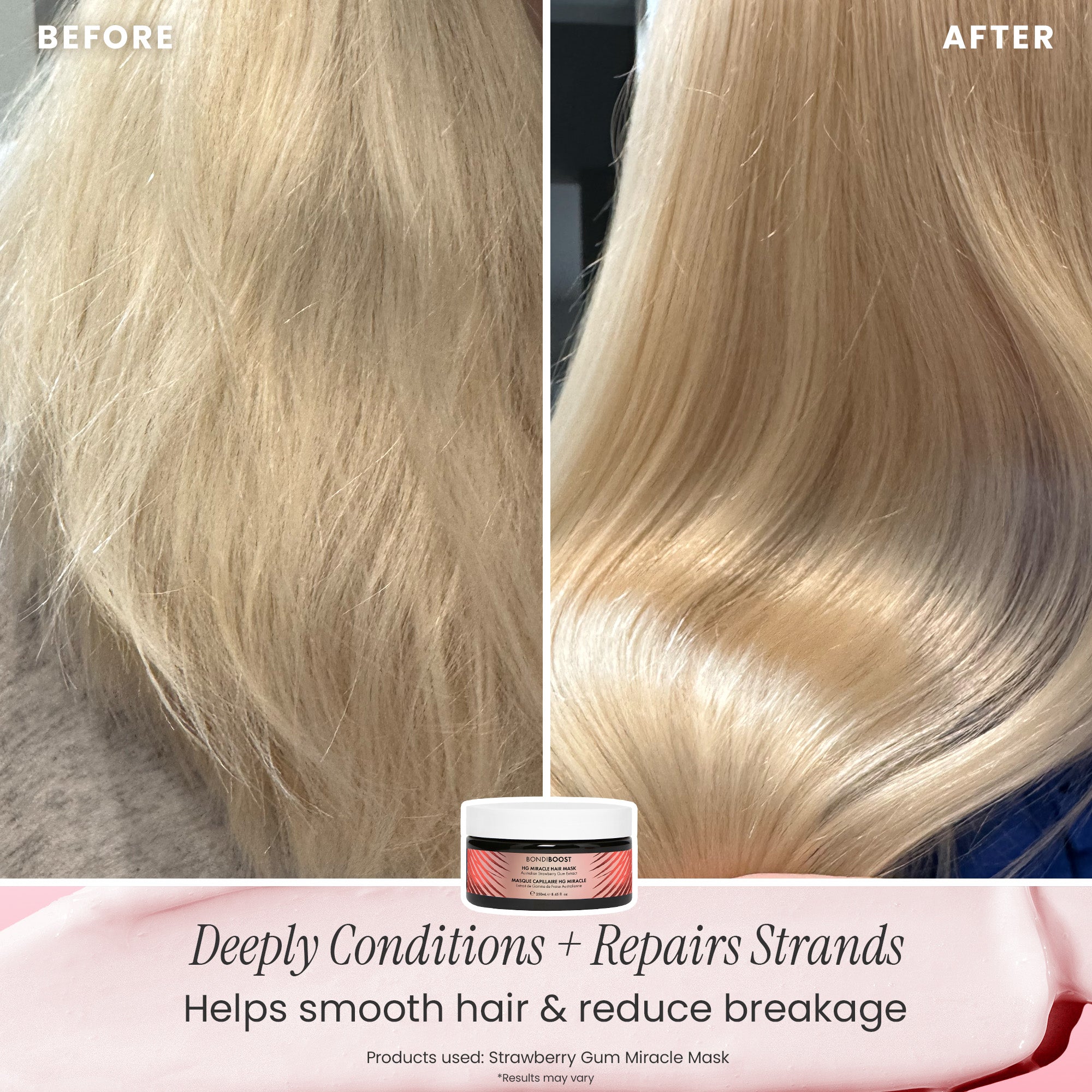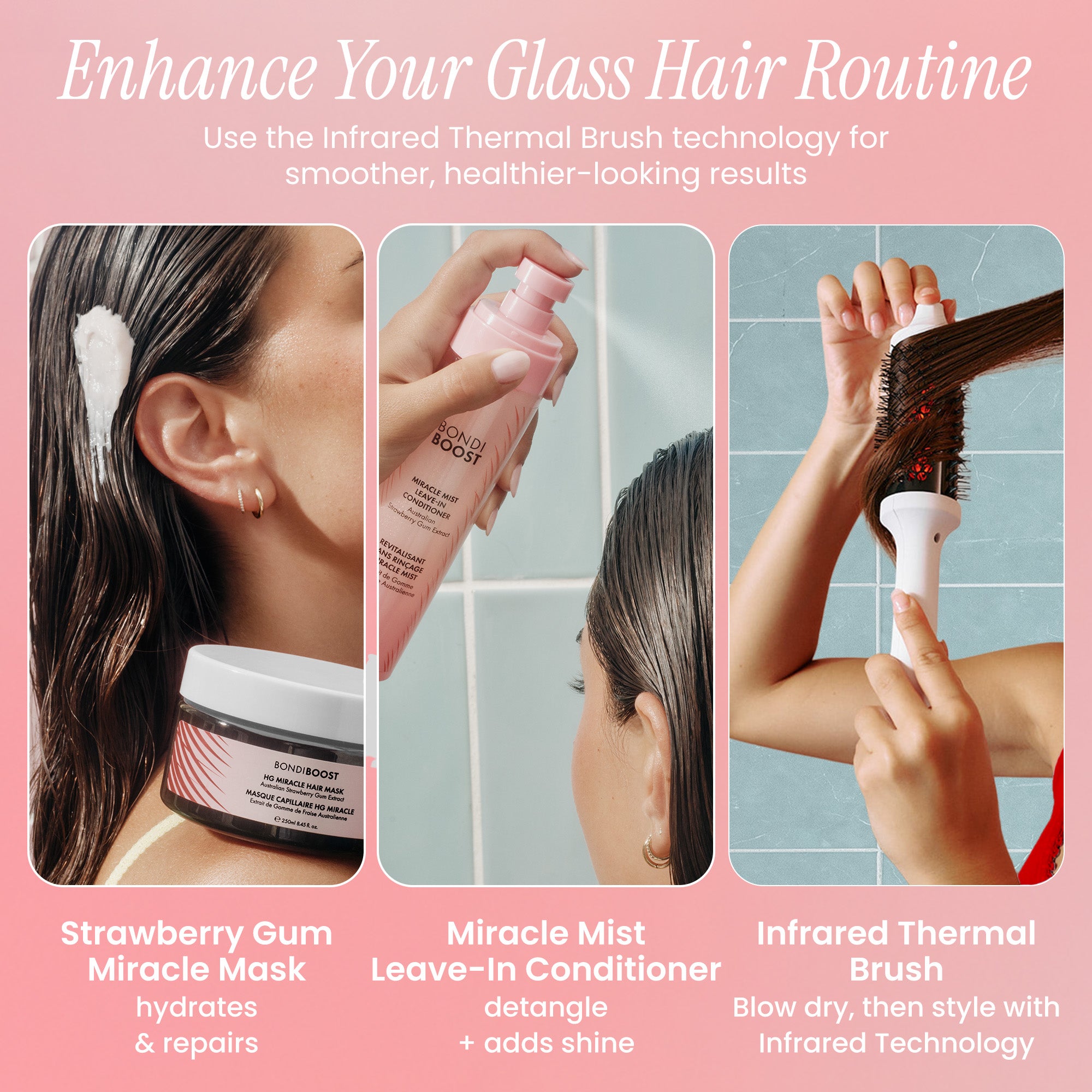 The Strawberry Gum Glass Hair Duo combines our clinically proven Strawberry Gum Miracle Hair Mask with the new Miracle Mist Leave-In Conditioner to deliver stronger-looking. shinier. heat-protected hair in one high-performance routine.