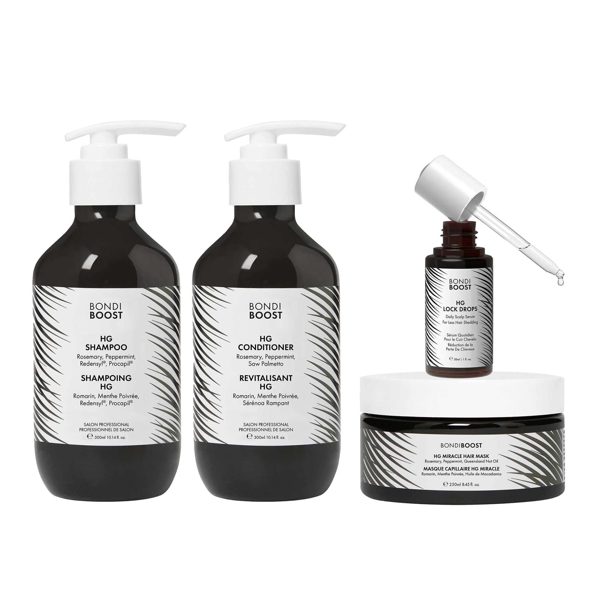 Four targeted steps. One focused routine designed to support hair health throughout your GLP-1 journey. The HG Shampoo gently cleanses to refresh the scalp. the HG Conditioner helps strengthen and soften strands. the Miracle Hair Mask delivers deep nourishment and repair. and the Lock Drops provide daily scalp support to help anchor hair at the root.